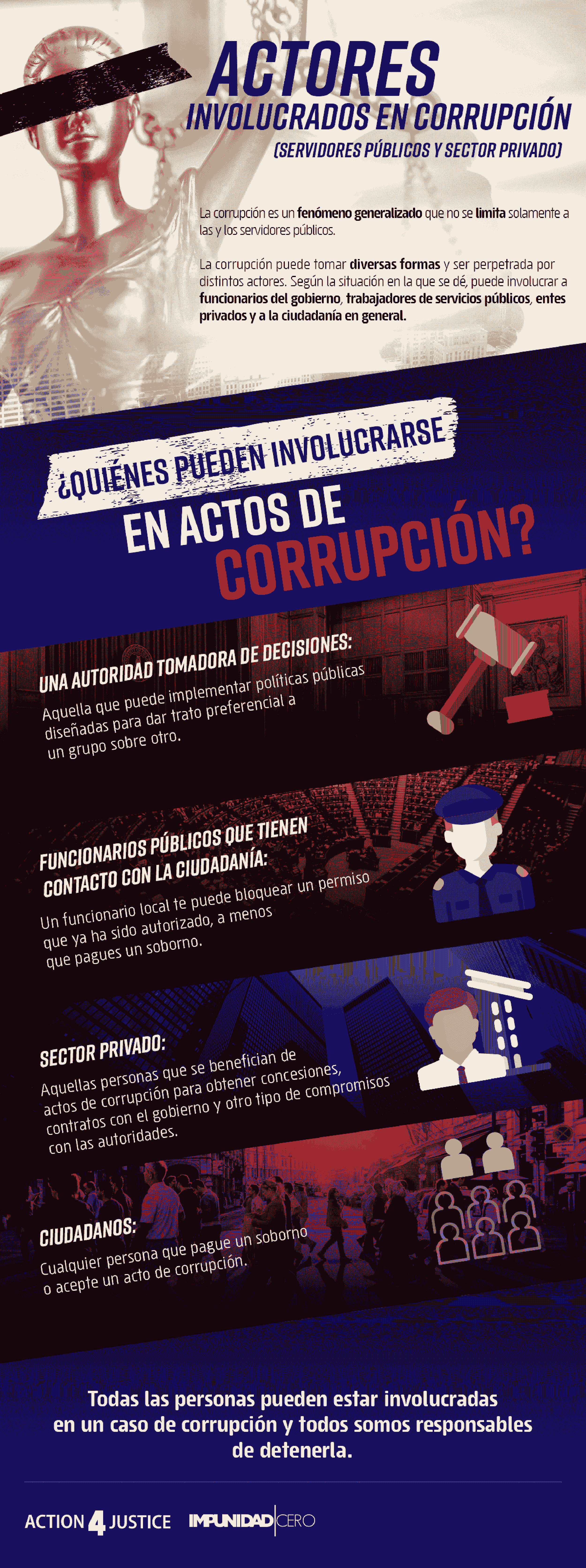 La corrupción es cometer, incitar o facilitar el abuso del poder público para obtener un beneficio privado. Esta infografía puede ayudarte a identificar los diferentes tipos de corrupción, así como sus impactos y las personas que pueden cometerla.