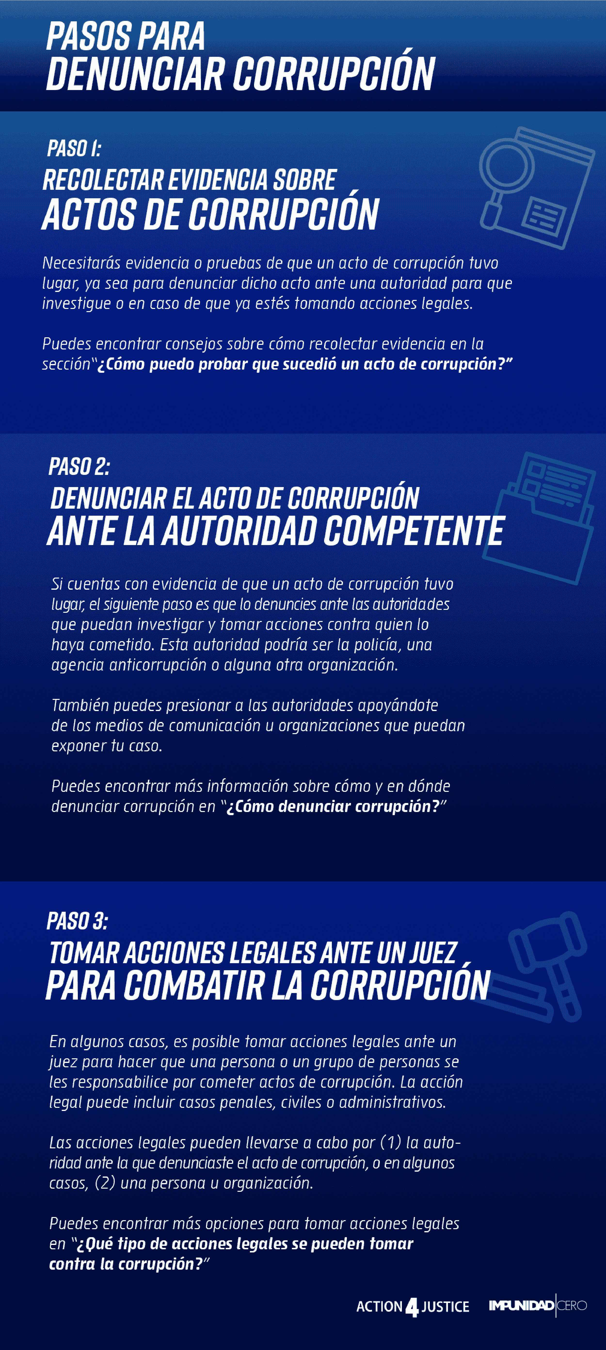Sin embargo, es importante saber que esta Guía tiene un alcance general. Explica diferentes medios para reportar, así como leyes, mecanismos legales y estrategias que pueden utilizarse para denunciar corrupción en diferentes países. Si después de leer esta Guía estás pensando en utilizar algún medio legal para combatir la corrupción, necesitarás: