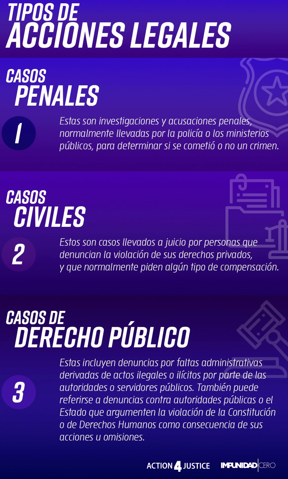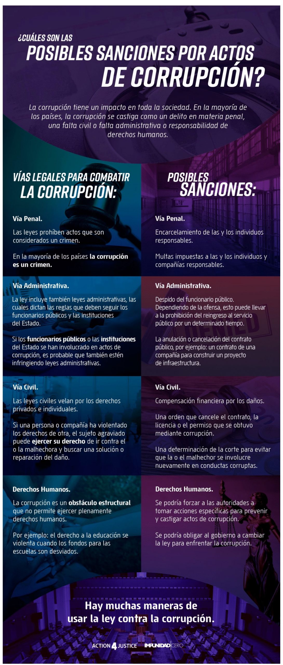 Existen distintas formas de hacer frente a la corrupción a través de una estrategia legal. Una acción legal se define como el proceso de llevar un caso ante un tribunal y esto puede ser a través de una demanda o de una denuncia penal. Esta Guía está diseñada para brindarte ideas y tips sobre cómo ejercer acciones legales para combatir la corrupción.