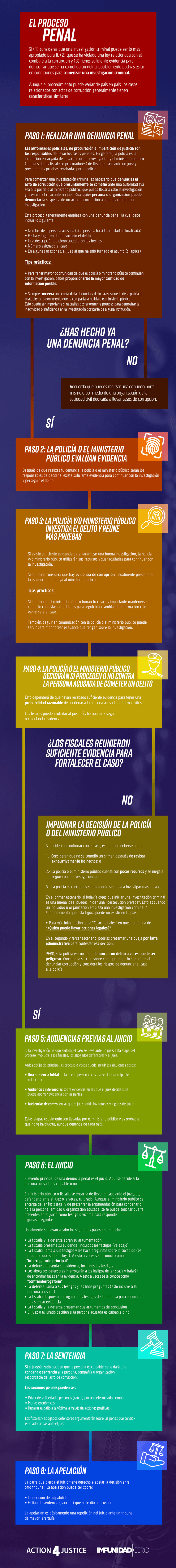 Si reportas un acto de corrupción ante un policía o ante un fiscal/ministerio público, se iniciará una investigación criminal. Esta sirve para determinar si la persona acusada de cometer un acto de corrupción, cometió un crimen o no. Por ejemplo, el soborno es considerado un delito en casi todos los países. Si este es detectado y condenado efectivamente, se pueden prevenir otros crímenes relacionados con este acto de corrupción.