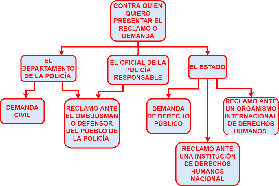 En el diagrama de flujo mostrado más abajo, se muestra una visión general de como fortalecer sus derechos en estos escenarios descritos antes. Por favor note que estos mecanismos son las avenidas más comunes para poder fortalecer sus derechos, pero puede que existan otras opciones disponibles para usted.