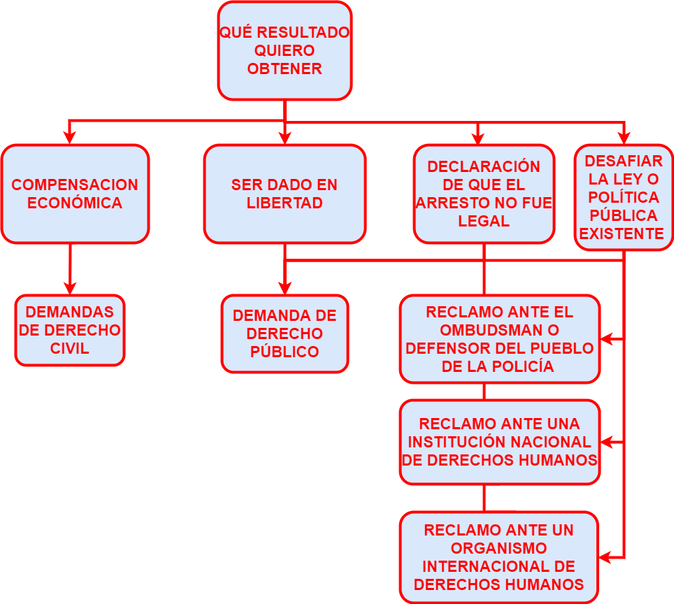 Una vez que usted ha decidido qué tipo de reclamo quiere hacer, en contra de quién y dónde, es siempre una buena idea contactar a un abogado para que le ayude. El abogado será capaz de ayudarle a decidir si tiene fundamentos, cuán solido es el caso y el mejor curso de acción que tomar, basado en los mecanismos nacionales existentes, opciones de apelación para obtener la libertad o solicitar compensación.