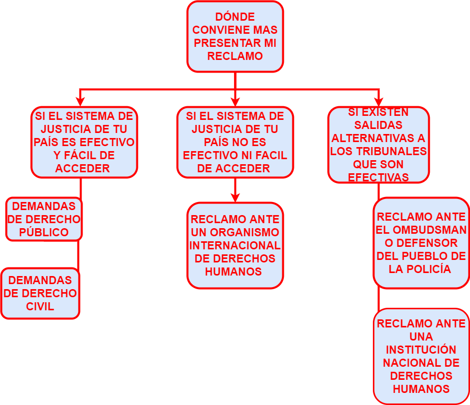 A continuación, usted debe considerar dónde se debe presentar el reclamo. Esto dependerá en los mecanismos para la presentación de reclamos existentes en su país: